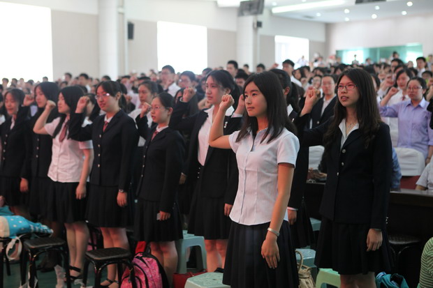 首先,由校党委书记 刘前树 领誓,高三460名同学面对鲜艳的国旗举起右手,进行宣誓:我们要捍卫神圣宪法,履行公民义务......谱写青春华章,建设锦绣中华。
