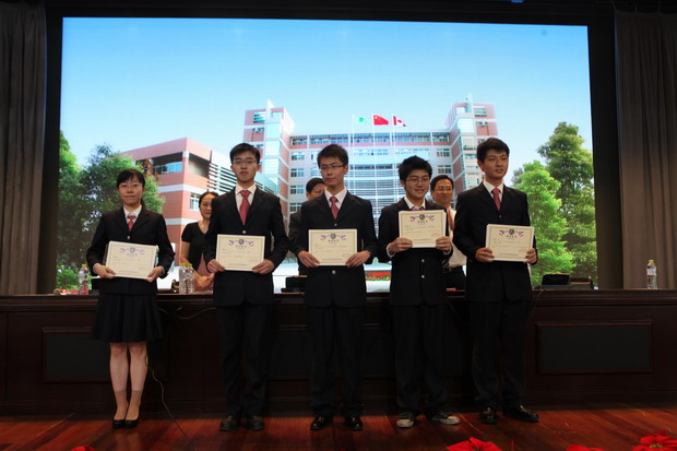 周 弋 副校长代表学校宣读了新葡的京集团43212013至2014学年“周恩来奖学金”获奖者名单。乔明达、许昊然、严靖凯、陆思聪、徐辰曦同学代表获奖同学上台领取证书,让我们向他们表示热烈的祝贺!