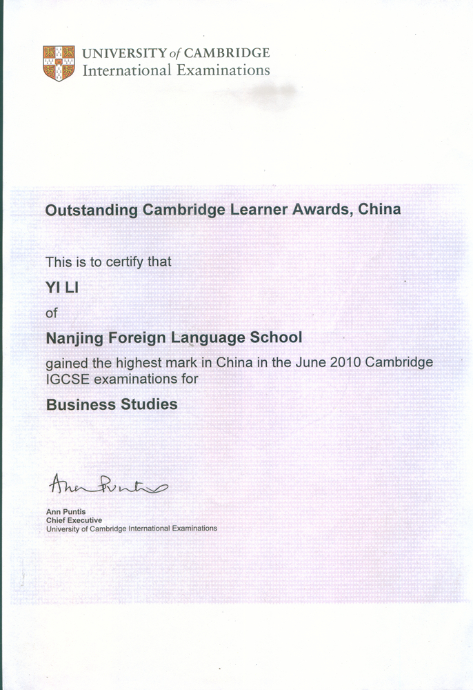 2012届剑桥班学生李奕获2010年剑桥国际考试委员会组织的剑桥IGCSE考试中国区商务学科最高分。