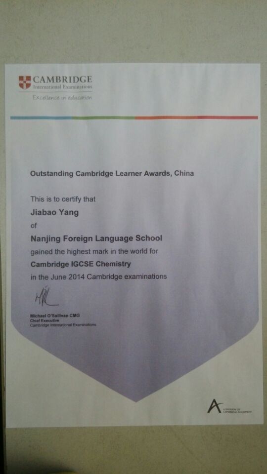 2016届剑桥班杨家宝获得2013年剑桥国际考试委员会组织的剑桥IGCSE化学全球最高分。