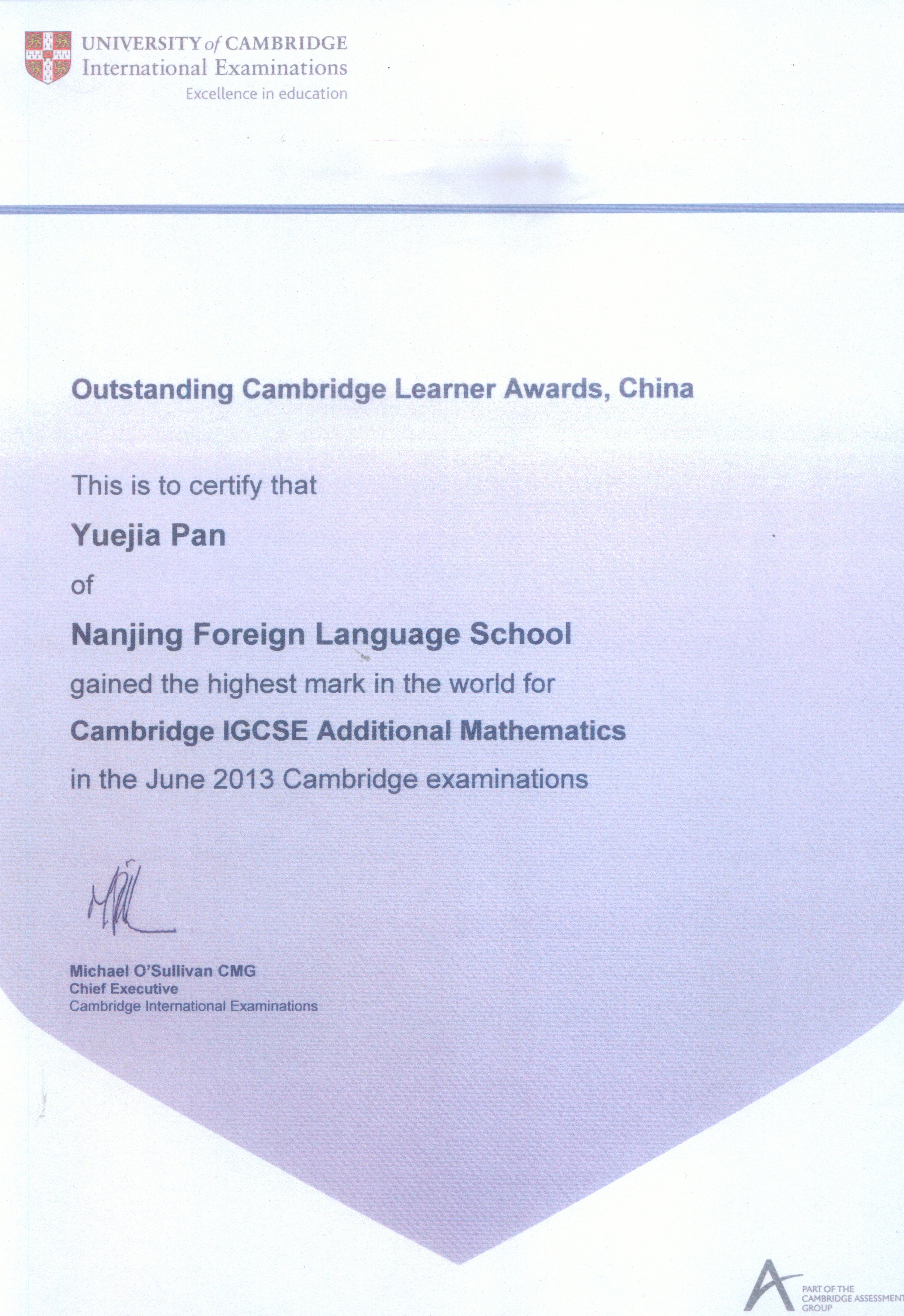 2015届IB班潘悦嘉获得2013年剑桥国际考试委员会组织的剑桥IGCSE附加数学全球最高分。