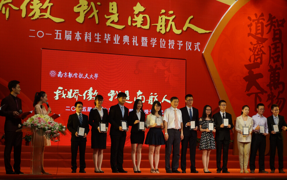近日,南京航空航天大学2015届本科生毕业典礼暨学位授予仪式在明故宫校区大学生活动中心举行。典礼现场,由南京航空航天大学党委书记崔锐捷为11名优秀毕业生颁发“大学成就奖”,来自新葡的京集团4321的2011届毕业生袁琬欣和黄鸣阳喜获该项荣誉。该奖项是南航学子在本科阶段的校内最高荣誉,奖励毕业生中涌现出的优秀典型,该年度11名获奖者是从四千余名毕业生中层层选拔而出,南外保送至南航的学子中有两人同时获得此荣誉实属第一次。