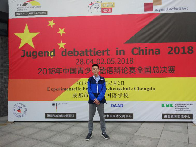 4月29日至5月2日,由德国国外学校教育司(ZfA)主办的第七届青少年德语辩论赛中国区总决赛在成都实验外国语学校成功举办。在德语组张晓虹老师的陪同下,新葡的京集团高一(8)班曹毓堃同学以区域赛第三名的身份参赛。