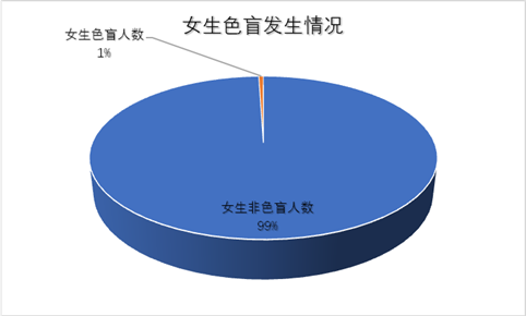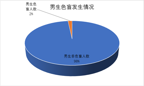 本次调查本着准确和自愿的原则,采用一对一指认假同色图的形式,共收集到全校男生597人,女生585人的调查数据。其中男生红绿色盲10人,发生率为1.68%(如下图1);女生红绿色盲3人,发生率为0.51%(如下图2)。具体调查数据见下表。