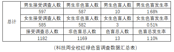 11月20日至11月30日,初二各班的班长、生物课代表利用午休、上下午大课间的时间在初一、初二、高一、高二、高三教室进行了科技周全校红绿色盲调查。