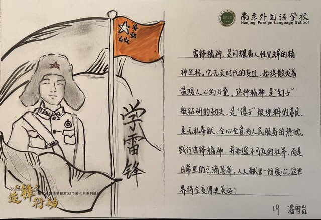 同学们精心准备了以“弘扬雷锋精神,砥砺奋斗青春”为主题的晨会。同学们在晨会中分享为人民服务的亲身体会,还展现了雷锋精神中的创新精神和环保精神。我们都在用实际行动践行雷锋精神,展现南外人积极向上无私奉献的青春风采。