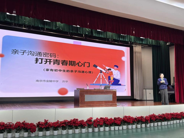 随后,会议特邀江苏省心理特级教师、南京市心理学科教学带头人苏华老师为家长们带来了一场题为《家有初中生的亲子沟通心理》的专题讲座。苏老师围绕青春期亲子沟通这一核心议题,从冲突原因、教育误区及沟通策略等方面进行了深入剖析,为家长们提供了科学的家庭教育指导。
